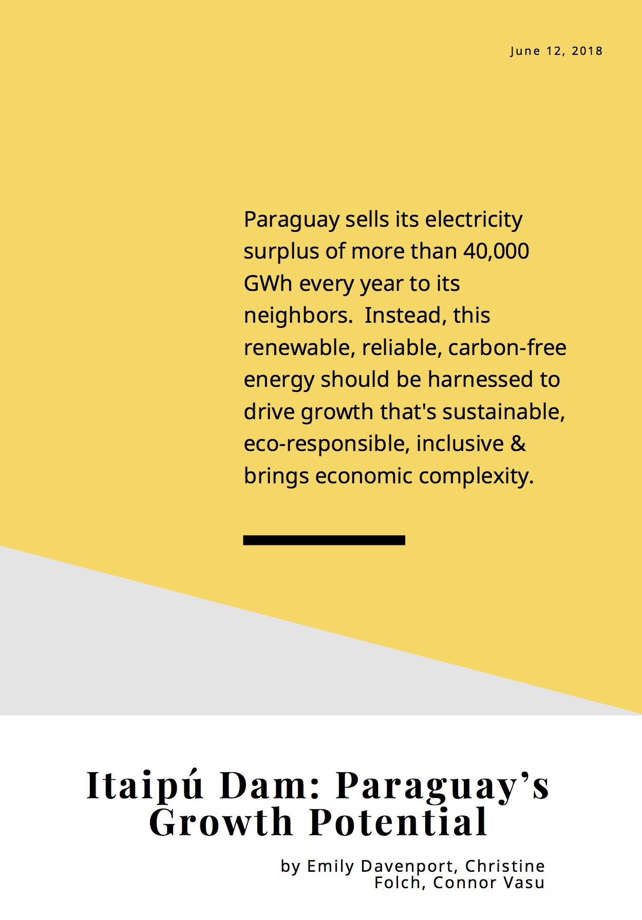 Paraguay has an electricity surplus of more than 40,000 GWh every year. Right now, it’s sold to its neighbors. In this white paper, we outline suggestions for how to put Paraguay’s electricity surplus to work by proposing how to harness the untapped electricity resources to drive an industrialization that is sustainable (socially, ecologically, financially), inclusive (alleviates poverty, raises living standards for the bottom of the pyramid), and builds internal economic complexity.